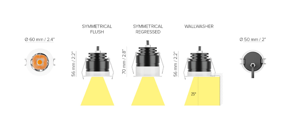 Apparecchio compatto da incasso dall’elevato comfort visivo con distribuzione luminosa simmetrica o wallwasher