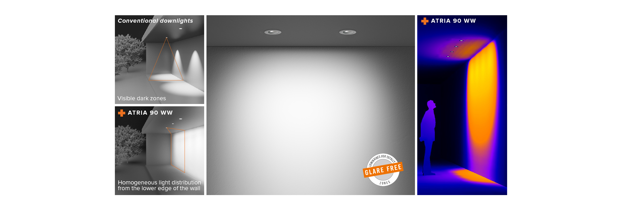 - Grazie al design del riflettore, l’apparecchio è completamente glare free con un controllo longitudinale dell’abbagliamento ed una distribuzione luminosa perfettamente omogenea sulla parete