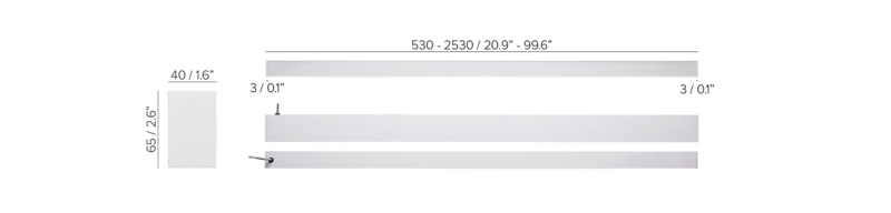 - Disponibile in incrementi di 250 mm: da 530 mm a 2530 mm e a richiesta è disponibile anche con lunghezza su misura