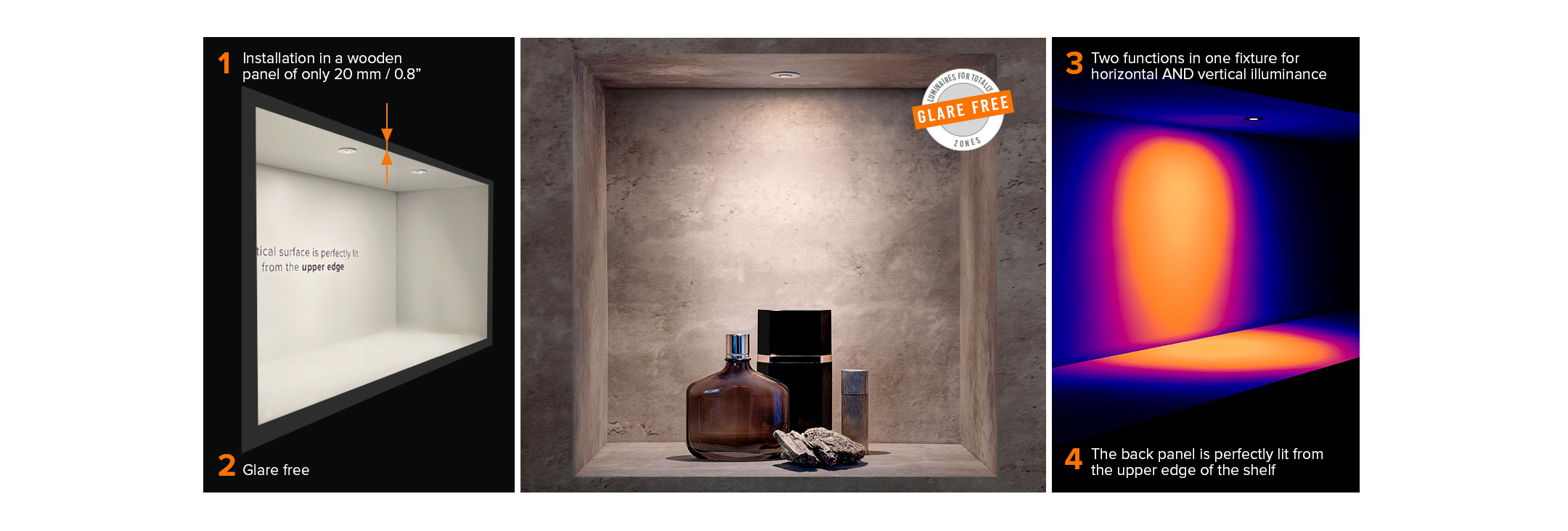 - The downlight delivers 25° on the horizontal surface and simultaneously a wallwasher effect on the wall. The vertical surfaces are perfectly lit from the upper edges of the wall with no visible dark zones