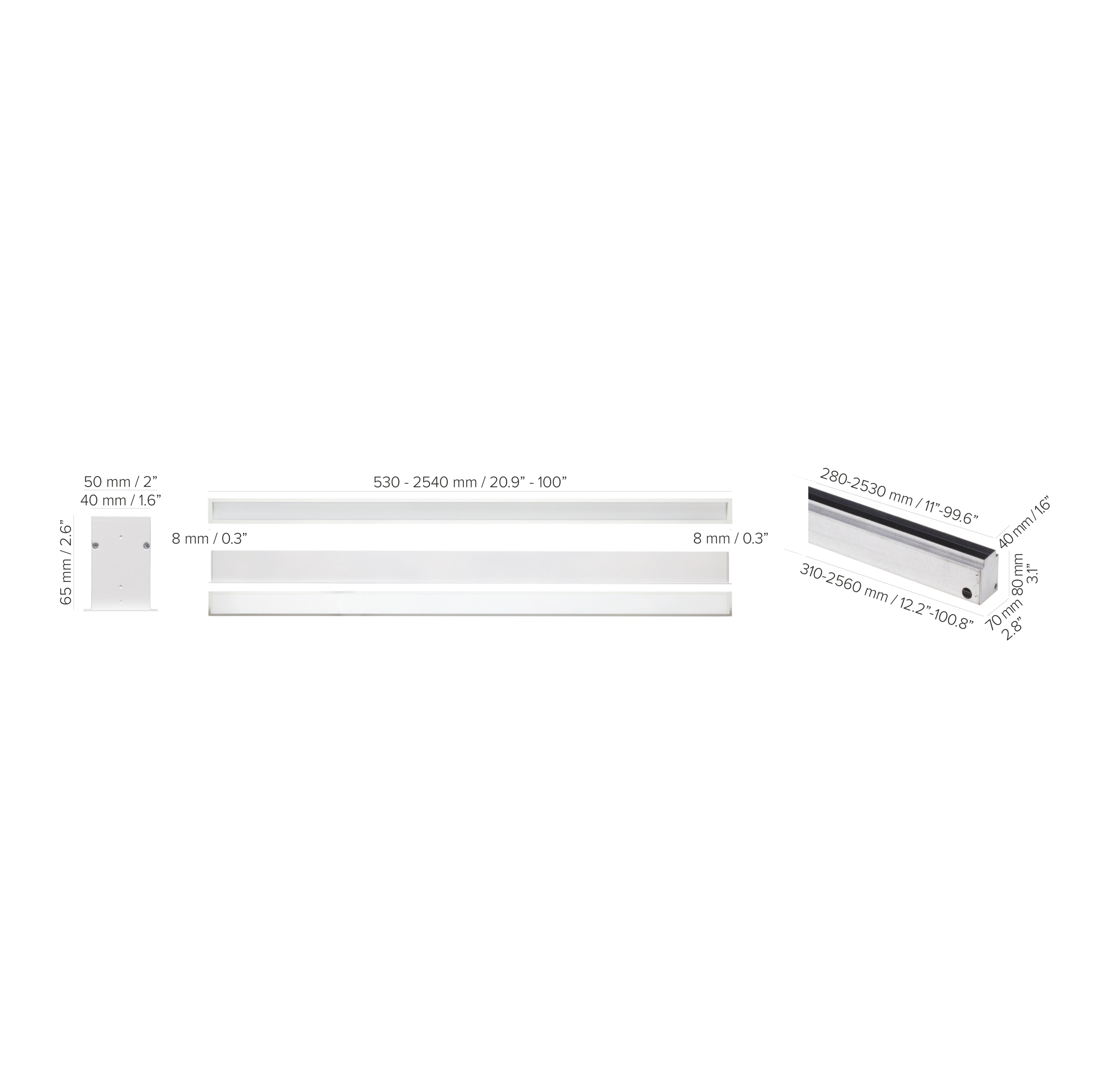 - Available in increments of 250 mm: from 530 to 2530 mm and upon request available with custom measurements.
