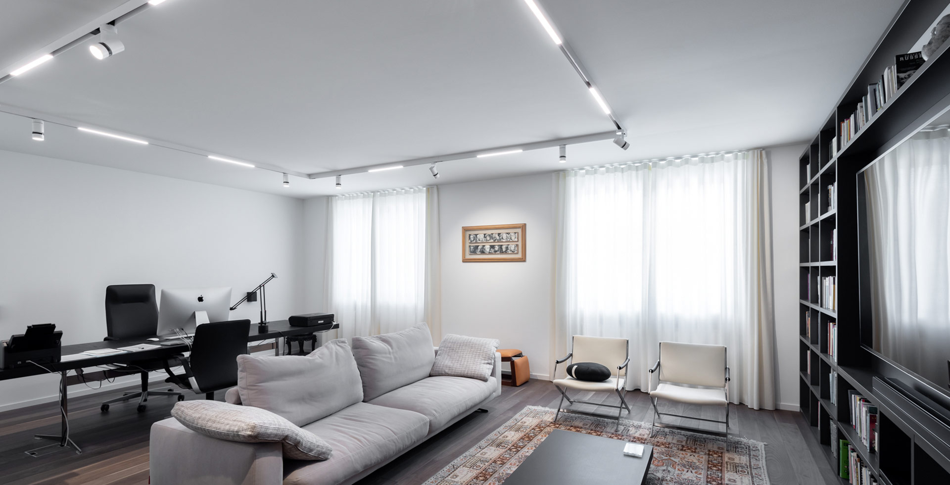 The executive office also has a living area for a relaxed and informal welcome, and was lit using THE MAGNET TRACK CL, on which INSERTO SMALL TRACK luminaires were installed for diffuse light, and CYLINDER 75 adjustable projectors for direct lighting to be directed onto elements such as pictures hanging on the walls and the side bookcase.