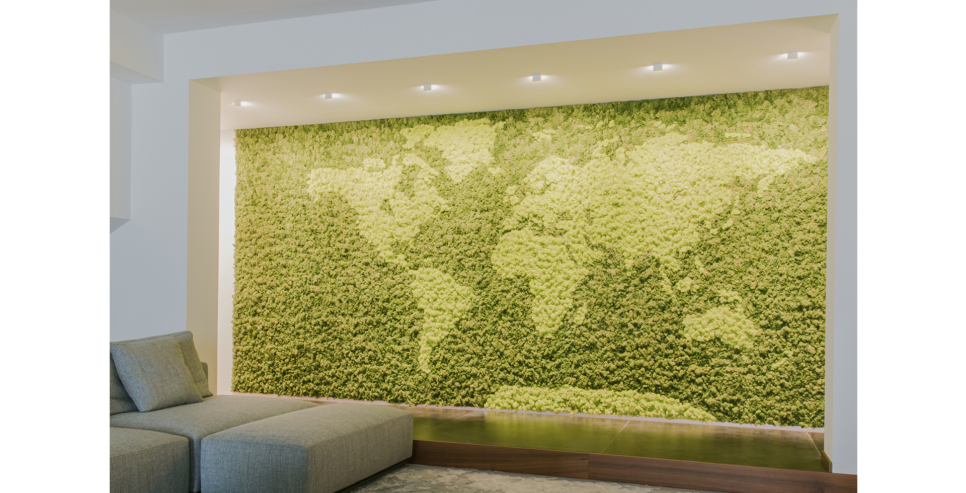 La residenza è caratterizzata da un’architettura essenziale ed un arredo moderno che vengono corredati nella zona giorno da una parete in lichene stabilizzato raffigurante il mappamondo.