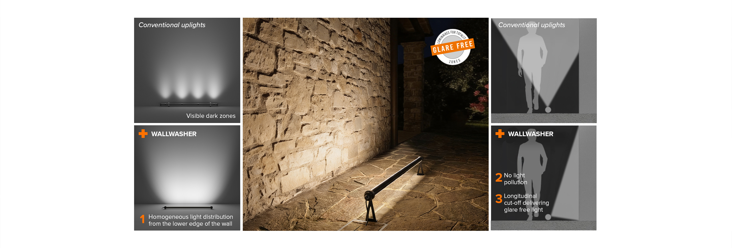 - Thanks to the design of the reflector, the fixture is glare free offering a longitudinal cut-off and delivering homogeneous light distribution on the wall