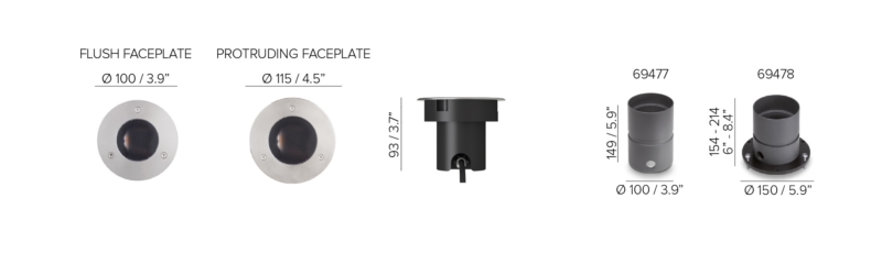 - Diameter: flush faceplate: 3.9″, protruding faceplate: 4.5″
